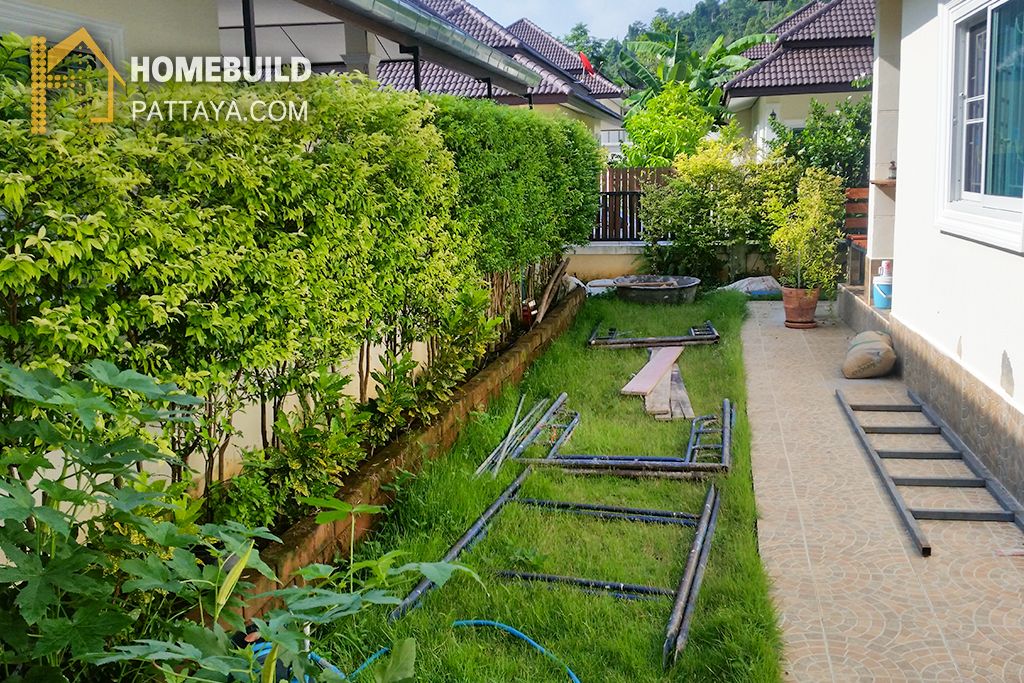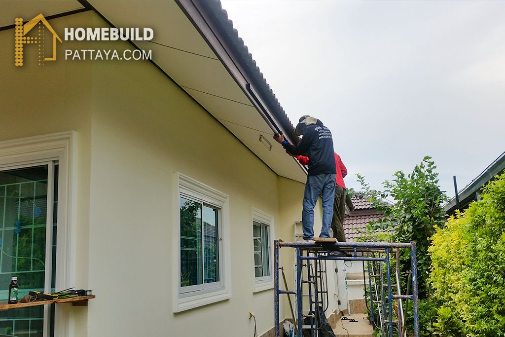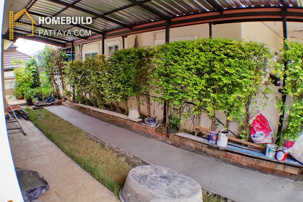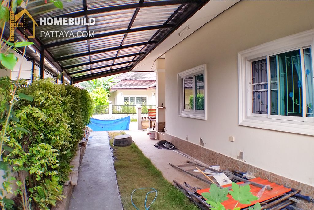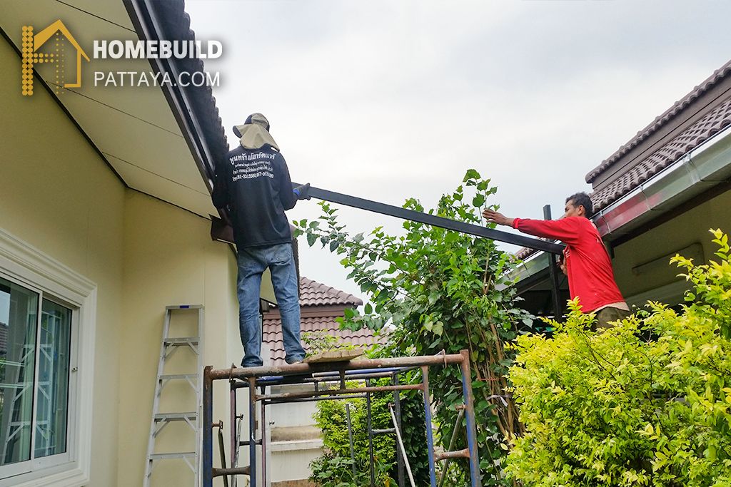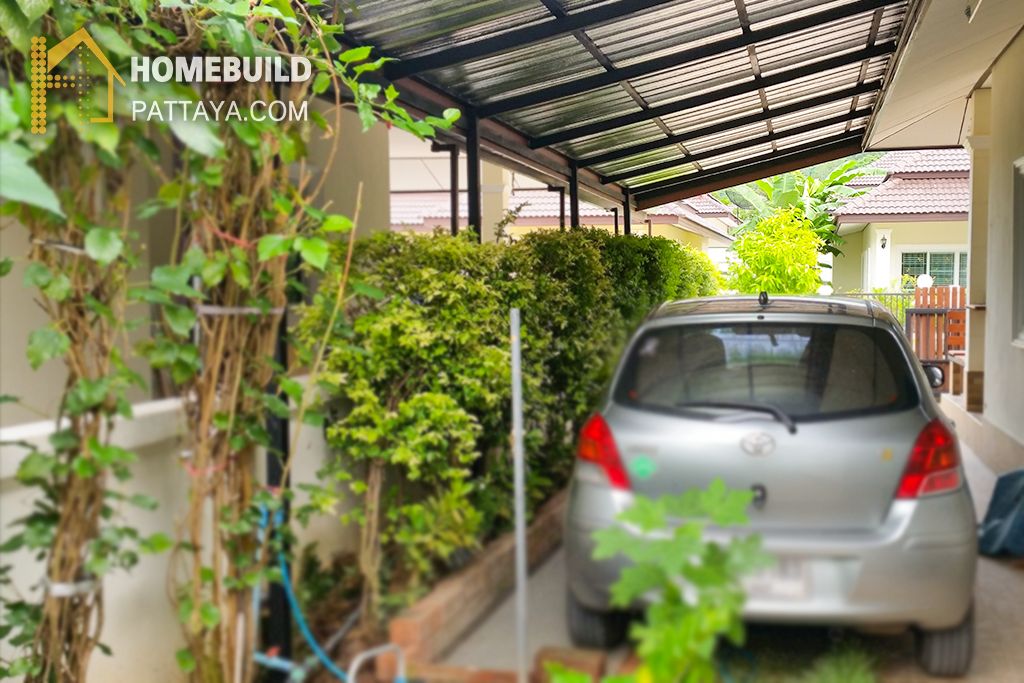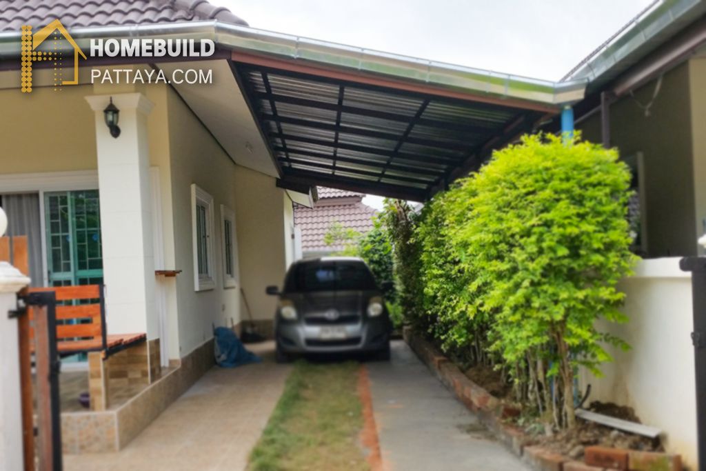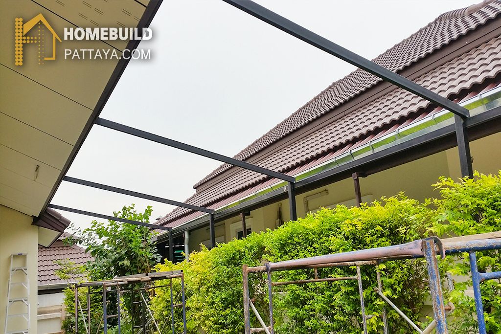 ผลงานการต่อเติมหลังคาโรงจอดรถ ในหมู่บ้านมิรันดา ต.บางเสร่ ด้วยหลังคาเมทัลชีต สามารถจอดรถได้ 2 คัน พร้อมติดตั้งรางน้ำฝน โครงสร้างเป็นเหล็กกันสนิม